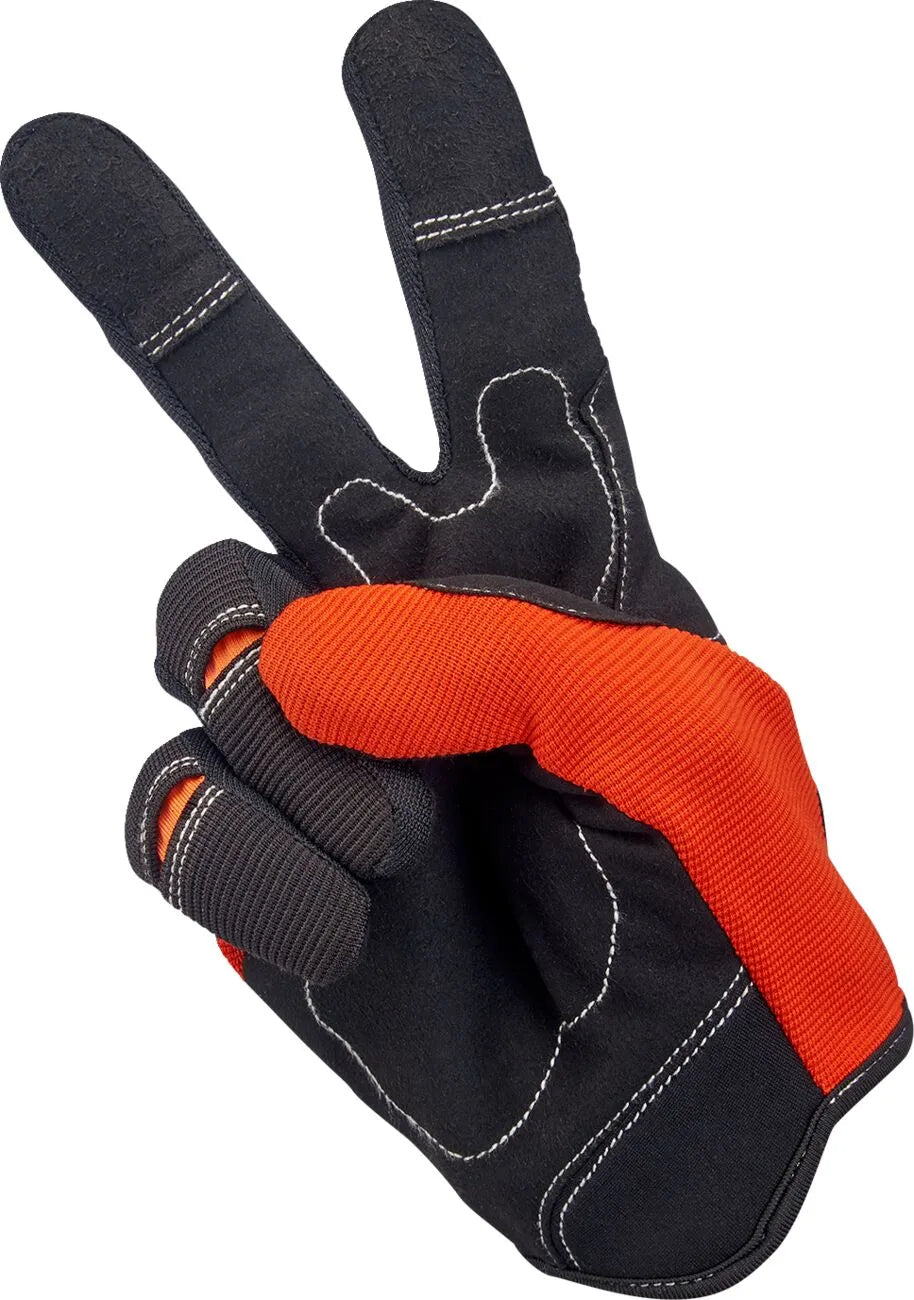 Crafted with two-way stretch polyester back panels, these gloves provide exceptional comfort and flexibility. The single-layer synthetic leather palm, reinforced with a durable thumb panel, delivers excellent grip and handlebar feel. Adjustable wrist wraps with Velcro closures ensure a snug and secure fit, while the thermoplastic rubber Biltwell shield adds protection. Lycra expansion panels in the finger joints enhance dexterity, and accordion baffles on the finger joints provide added flexibility. With rugged single- and double-needle polyester stitching, these gloves are built to withstand the demands of regular use, offering both performance and longevity. They also feature Touchscreen Enabled Fingers, allowing you to easily operate your devices without removing your gloves.Features & highlights