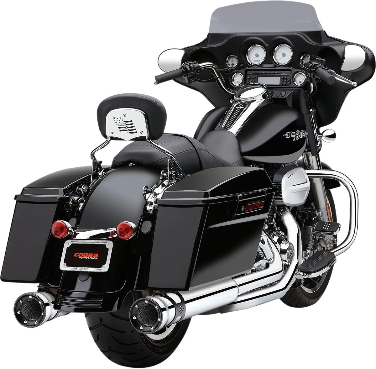 Cobra Race-Pro Slip-On Avgasrör använder avancerade akustiska tekniker för att producera ett distinkt, djupt muller. Med 3" kärnor inneslutna i Cobras proprietära ljudmaterial, erbjuder dessa ljuddämpare specifik akustisk dämpning och värmeisolering. High-flow-kärnorna har strategiskt placerade perforeringsmönster som sprider mellanregisterfrekvenser, vilket förstärker de låga frekvenserna för en rikare och mer tillfredsställande ljudbild. Den 4" runda ljuddämparen fram expanderar till 4.5" diameter strax bakom stålklämman. PEM®-fästen förenklar installationen genom att möjliggöra enkel gängning av bultar från det övre fästet in i Cobra-remmen. Dessa slip-on avgasrör är tillverkade i USA, vilket garanterar hög kvalitet och prestanda. Uppgradera din motorcykel med Cobra Race-Pro slip-on avgasrör och upplev skillnaden.