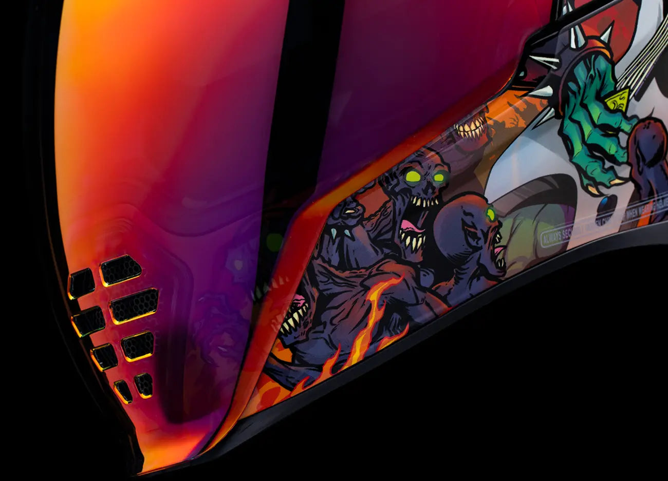 The Icon Airflite™ Blegh MIPS® Helmet features an injection-molded polycarbonate shell, providing exceptional strength and impact resistance. The integrated MIPS® (Multi-directional Impact Protection System) reduces rotational forces during certain impacts, adding an extra layer of safety. Stay cool and comfortable with the recessed twin-channel supervent cooling system and multiple oversized intake and exhaust ports, ensuring optimal airflow. The Fog-Free Dropshield™ with an exterior switch offers convenient visibility adjustments, while the Quick-change Fog-Free Fliteshield™ with side plates allows for easy shield swaps. The removable Hydradry™ moisture-wicking liner keeps you dry and comfortable, even during long rides. The internal speaker pockets are compatible with ICON's R.A.U. Bluetooth device, letting you stay connected on the go. Plus, the glow-in-the-dark accents ensure you'll be seen, even in low-light conditions.