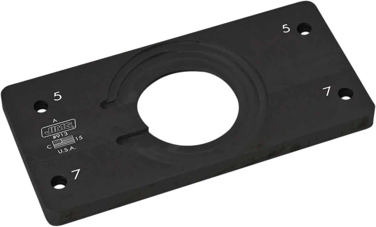The Jims Wheel Bearing Puller/Hub Protector Support Plate is designed for accurate and efficient wheel bearing service. By utilizing two of the rotor mounts, it creates a strong and stable surface for your bearing puller to operate. This innovative design ensures that the hub's finish remains undamaged during the process, preventing costly repairs or replacements. The support plate attaches directly to the brake rotor mounting holes, offering a secure and reliable connection. Compatible with open-hub wheels featuring 5 or 7 lugs, this tool is a versatile addition to any motorcycle mechanic's arsenal. Trust Jims for high-quality, precision-engineered tools made in the USA.