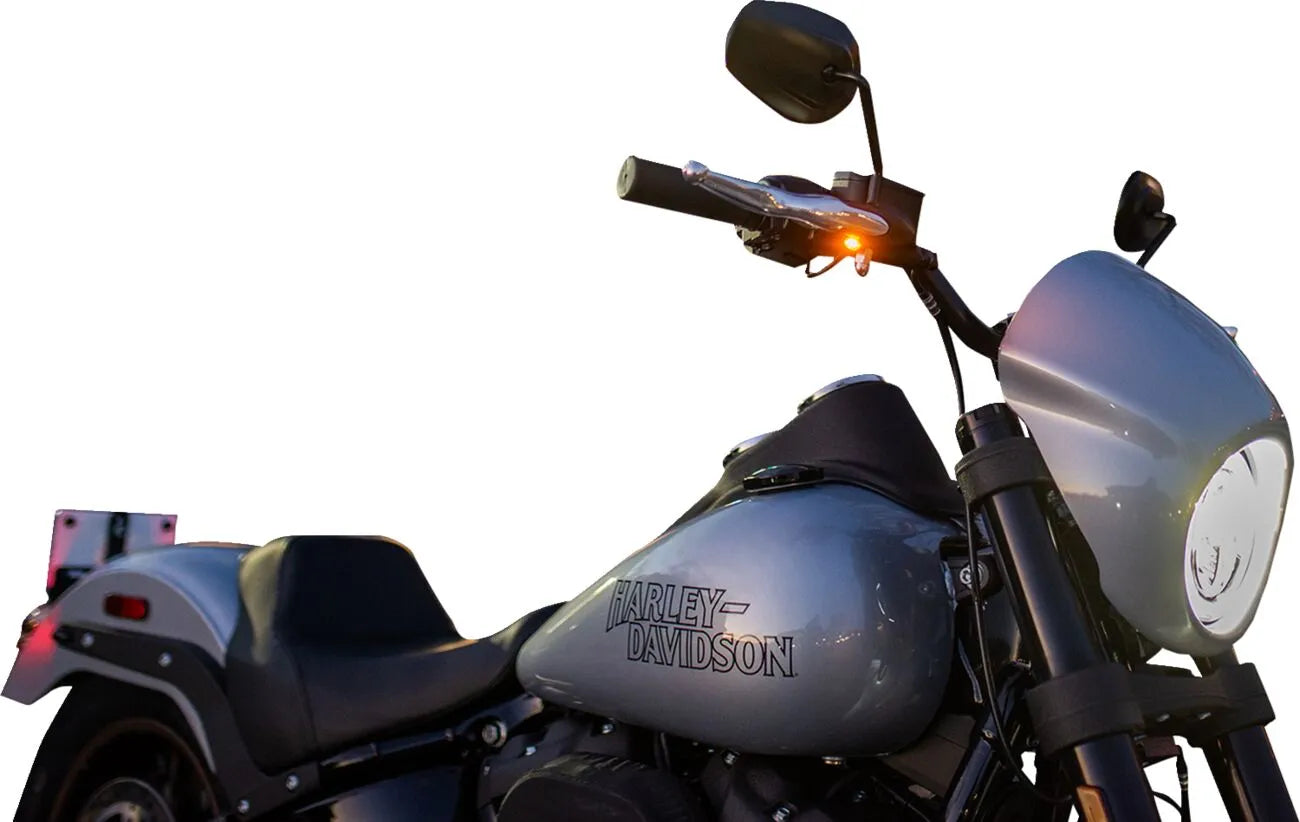The Kodlin Elypse LED 2-1 Front Turn Signals are engineered in Germany using advanced SMD-LED technology, ensuring exceptional brightness and reliability. The super-small design is housed in CNC-machined billet aluminum, providing durability and a premium look. The black housing and smoke lens further contribute to the sleek aesthetic, seamlessly integrating with your bike's style. These turn signals not only enhance your motorcycle's appearance but also significantly improve your visibility to other drivers, increasing your safety on the road. Easy to install and built to last, the Kodlin Elypse LED turn signals are a must-have upgrade for any motorcycle enthusiast looking for both style and performance. The combination of running light and turn signal in one compact unit makes these lights a very attractive solution to improve your safety.