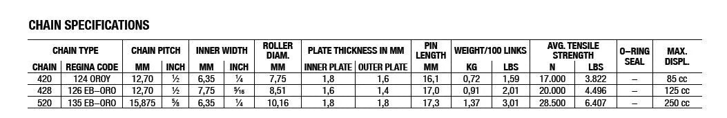Built for motorcycles up to 85cc, the Regina 420 Oroy chain features larger diameter alloy carbon steel pins and thicker plates, significantly increasing tensile strength and fatigue resistance. The extended bushings and solid rollers further enhance durability, providing smooth and efficient power transfer. This chain is designed to withstand the rigors of demanding riding conditions, offering peace of mind and consistent performance. Easy installation is facilitated by the included clip-type master link. Upgrade to the Regina 420 Oroy chain and experience the difference in quality and performance.