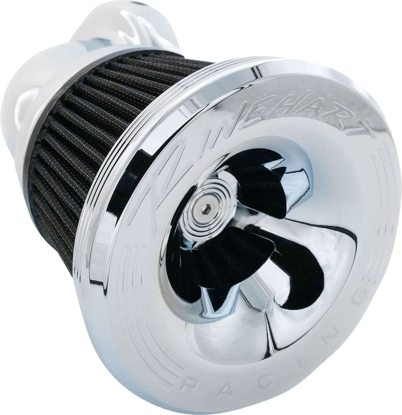 The Rinehart Racing Moto Series 90° Velocity Air Cleaner is designed for optimal airflow and rider comfort. Its forward-facing 90° intake not only enhances performance but also minimizes the chance of knee contact while riding. Available in chrome, this air cleaner offers a stylish upgrade to your motorcycle while delivering increased power and efficiency. Easy to install and built to last, the Moto Series air cleaner is an investment in your bike's long-term performance.