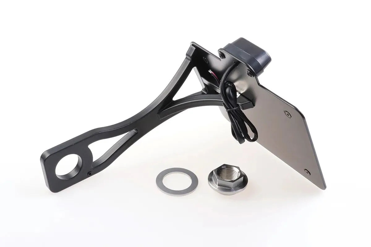 The Cult Werk License Plate Holder not only enhances the aesthetics of your bike but also offers practical benefits. The black powder-coated finish provides excellent resistance to corrosion and wear, ensuring a long-lasting appearance. Installation is straightforward, allowing you to quickly and easily upgrade your motorcycle's rear end. Included LED license plate lighting with an E-test mark ensures compliance and visibility. This holder is designed to withstand the rigors of the road, keeping your license plate securely in place.