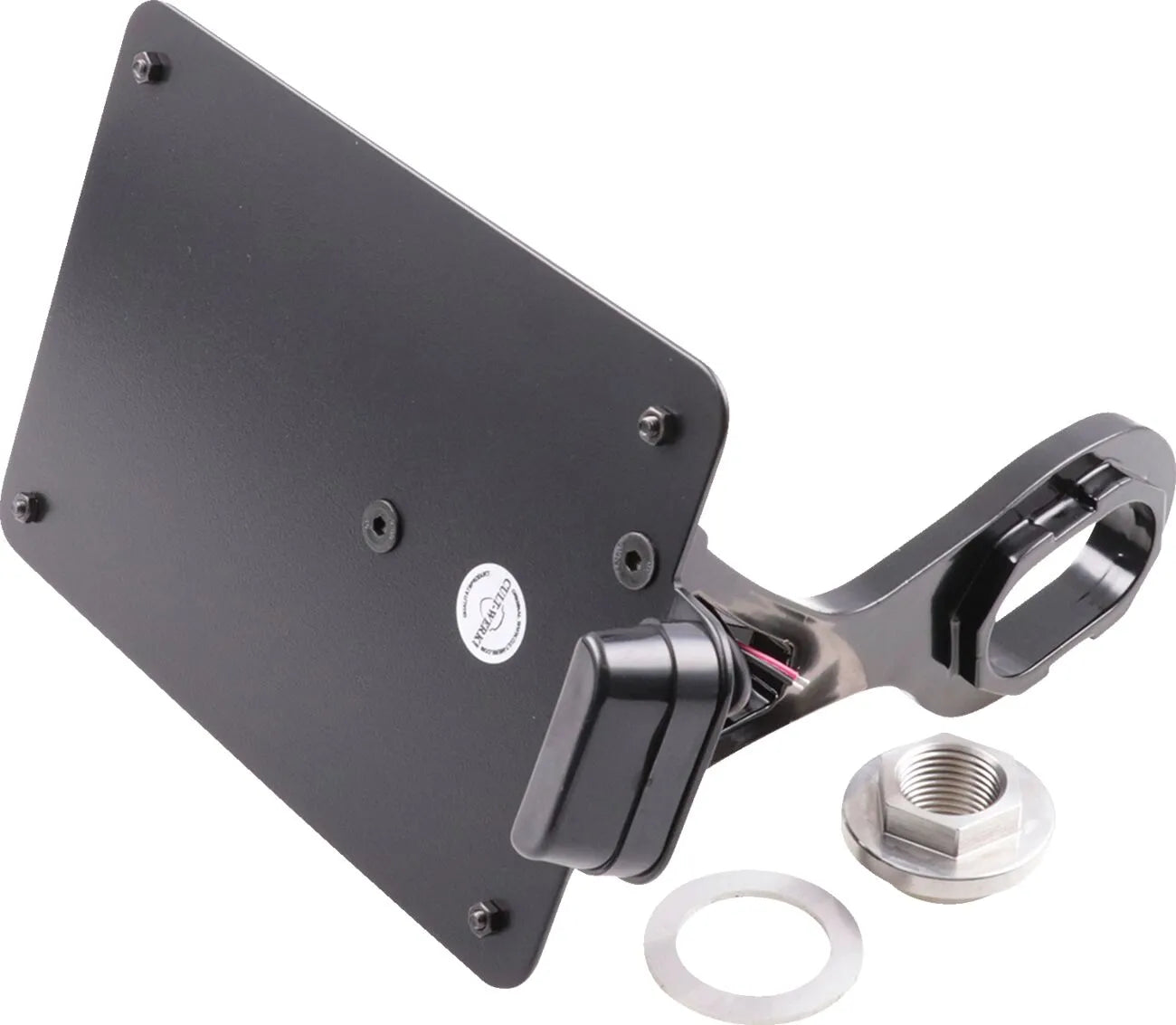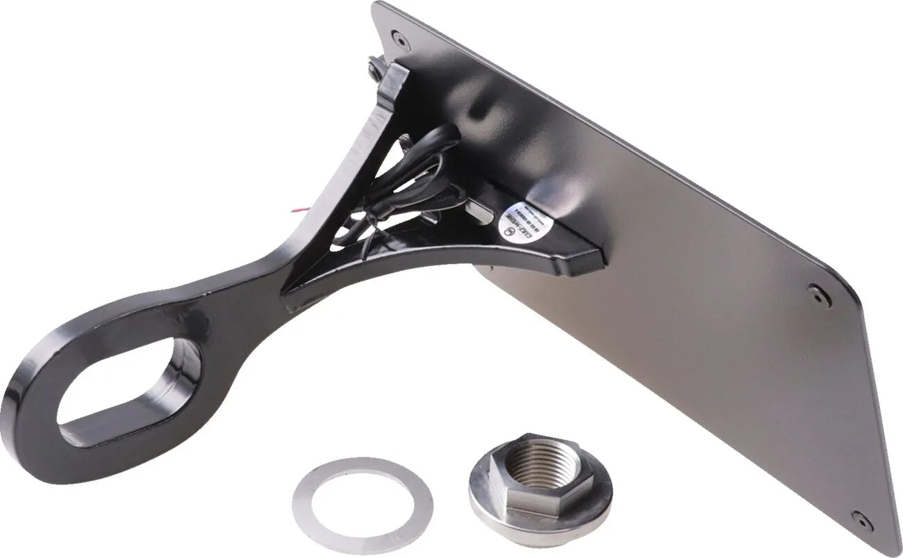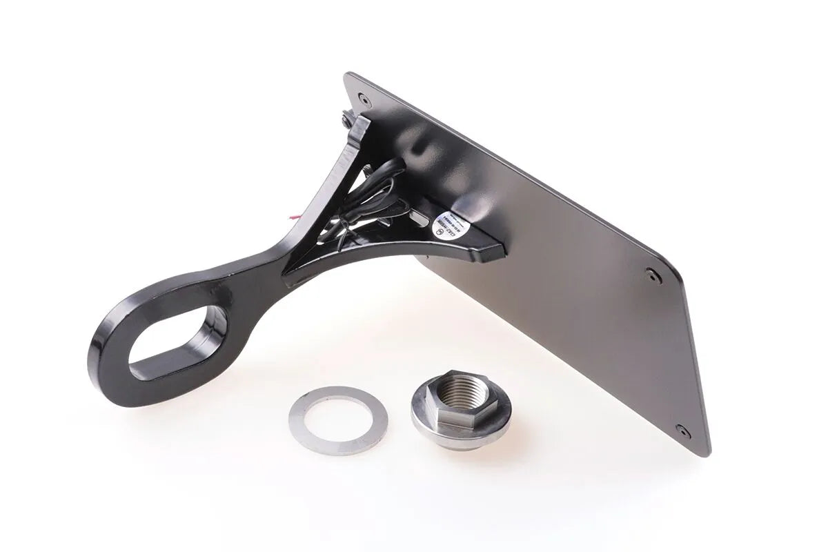Crafted from high-quality steel, this license plate holder is CNC lasered for precision and then powder-coated in black for a clean, custom look. The robust construction ensures long-lasting durability and resistance to the elements. Installation is straightforward, providing a seamless upgrade to your bike's aesthetics. This holder includes an LED license plate light, ensuring visibility and compliance with regulations. The included LED light features an E-test mark, guaranteeing its quality and legality for road use. Enhance the rear profile of your motorcycle with this stylish and functional license plate holder from Cult Werk.