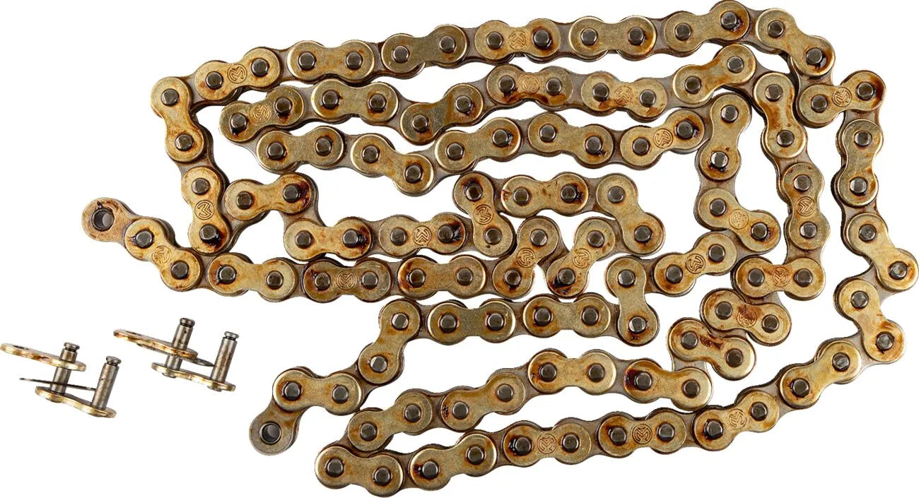 The Moose Offroad 520 RXP Pro-MX chain is specifically designed for demanding motocross applications, optimizing power delivery and durability. Its high-tensile-strength, nickel-plated inner link plates provide exceptional resistance to stretching and wear, while the rust-resistant, gold-plated side plates offer increased longevity and a premium look. This non-O-ring chain is pre-greased for smooth operation and reduced friction right out of the box. The included clip-type connecting link ensures easy and secure installation. Recommended for motorcycles and ATVs with engine displacements between 125cc and 350cc, the 520 RXP Pro-MX chain delivers the performance and reliability needed to conquer any terrain. Maximize the potential of your machine with this high-quality drive chain.