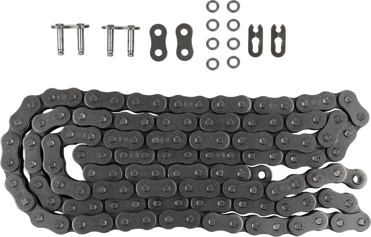 The Moose Offroad 525 X-Ring Drive Chain utilizes an innovative X-shaped, self-lubricating seal that maintains constant lubrication to critical components. This design provides up to seven times greater wear resistance compared to traditional O-ring chains, significantly extending the chain's lifespan and reducing maintenance intervals. The chain features extra high-tensile strength link plates, providing exceptional resistance to stretching and breakage under demanding conditions. Rust-resistant side plates protect against corrosion, ensuring long-lasting performance in all weather conditions. Solid roller inner links and inner bushings enhance strength and durability, contributing to smooth and efficient power delivery. Installation is simplified with the included clip-style connecting link.