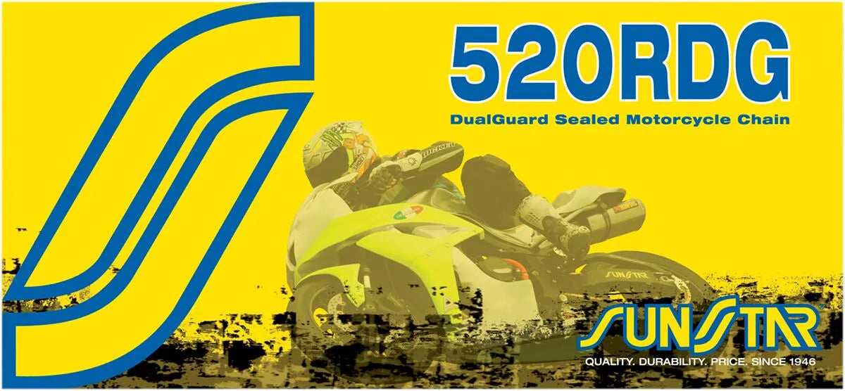 Experience superior lubrication and reduced friction with the Sunstar 520 RDG Drive Chain. Featuring a Dual Guard sealed ring, similar to X-rings, this chain utilizes two sealing lips and lubrication pools per side, enhancing lubrication in high-heat conditions. This design significantly outperforms standard O-ring chains with their single-sided, single-lip design. The natural-colored Sunstar 520 RDG is a versatile, all-around road chain, perfect for nearly any street motorcycle application. Trust Sunstar for a drive chain that delivers consistent performance and extended life, keeping you on the road longer. This chain is designed for motorcycles with up to 750cc engine displacement.